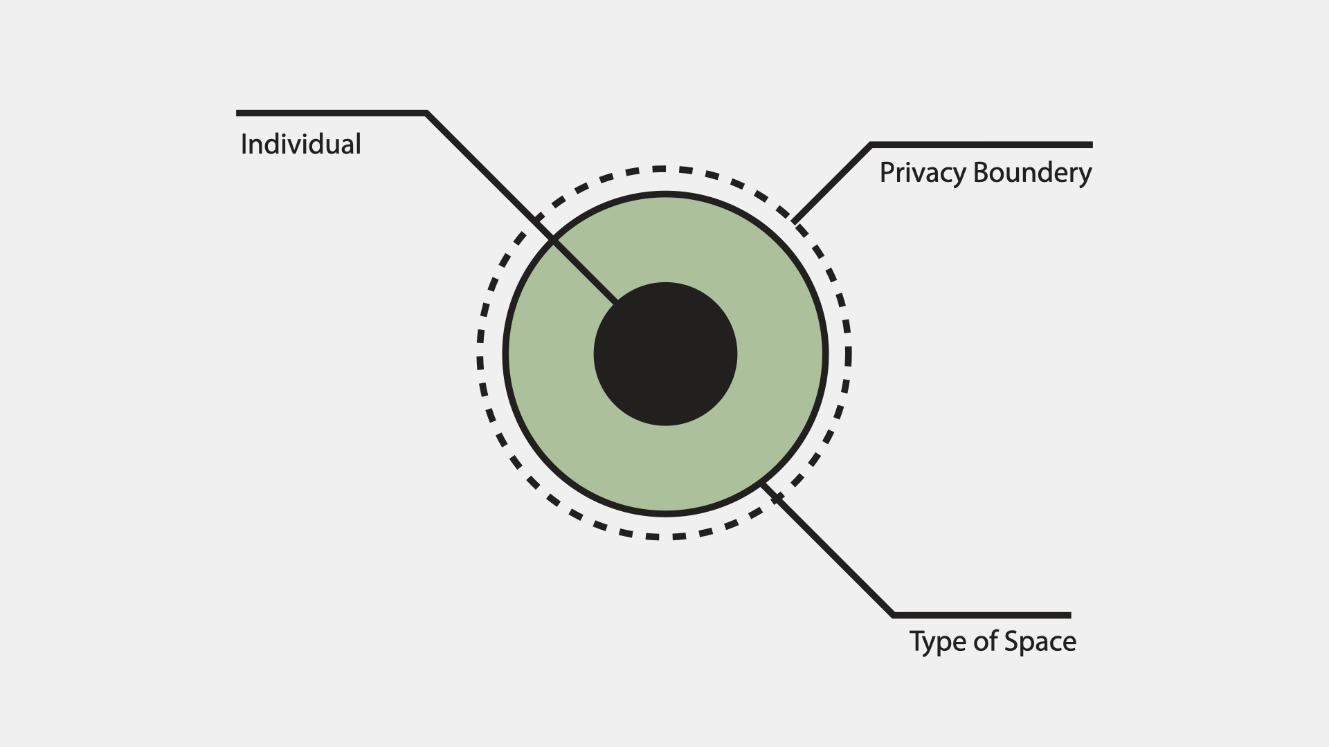 The privacy boundary is indicated by a dotted line. When the privacy boundary envelops the space, this indicates that the entire function of the space not only promotes privacy, but may be considered a private space. When the privacy boundary is drawn close to the individual, this indicates that the individual is highly guarded about both their privacy and security within that space.