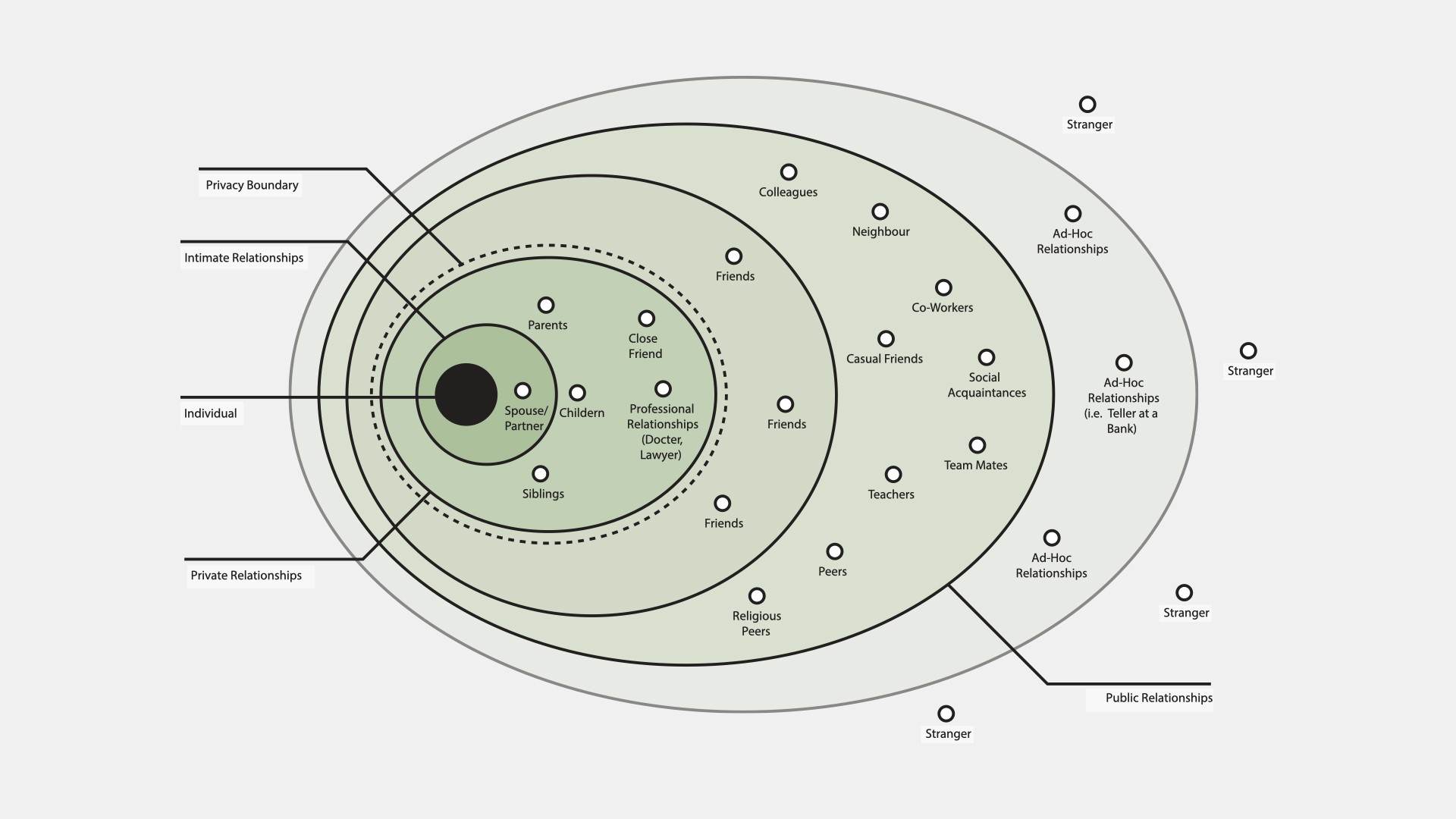 The privacy boundary indicates how much an individual may open up within a relationship. Those relationships that fall within the privacy boundary are highly valuable. The individual shares information (to varying degrees) about themselves to others.