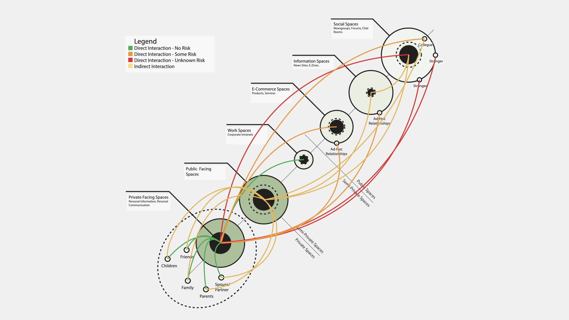 In the diagram (Figure 3), spaces and relationships are visually mapped. The diagram follows the same basic constructs of figure 1. Jumps indicate interactions, and the color associated with the jump implies its risk.