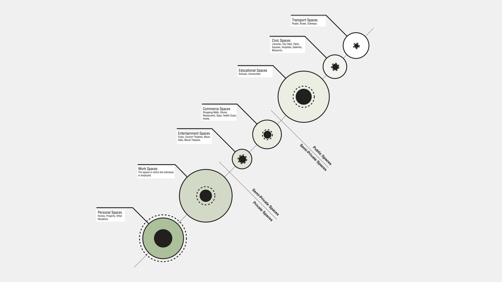 The most private space to the individual is that which they own, and are the gatekeeper to. The most public space to an individual is the street in which they use to move from one space to another. The diagram indicates those spaces as ‘Private’, in the lower left corner, and those spaces as ‘Public’, in the upper right corner.