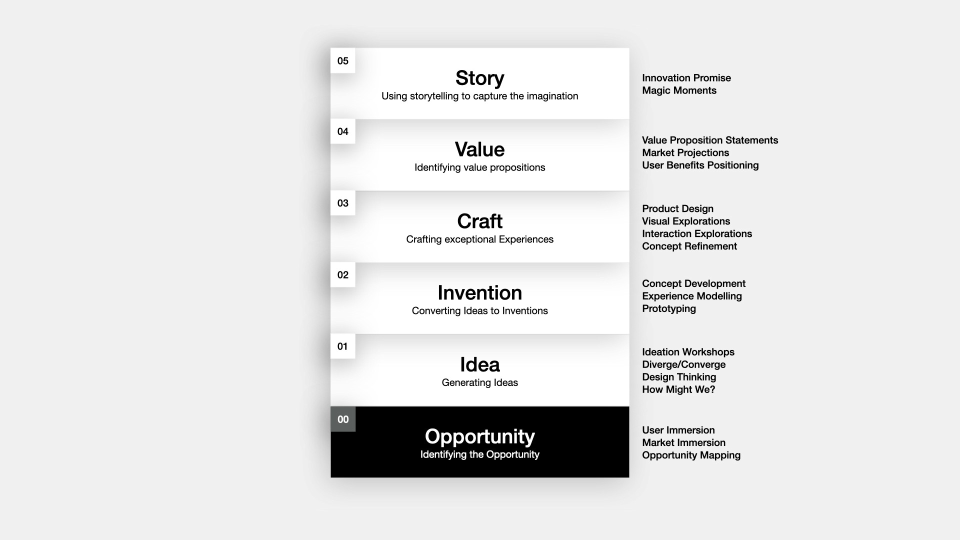 At a high level the Innovation Design Stack captures successive force multipliers as you move up from Level 01 through Level 05. Each level is a function which needs to be performed with dedicated teams and processes. As one moves up the stack, greater clarity of the innovation is captured. Each successive level can influence levels below and above.
