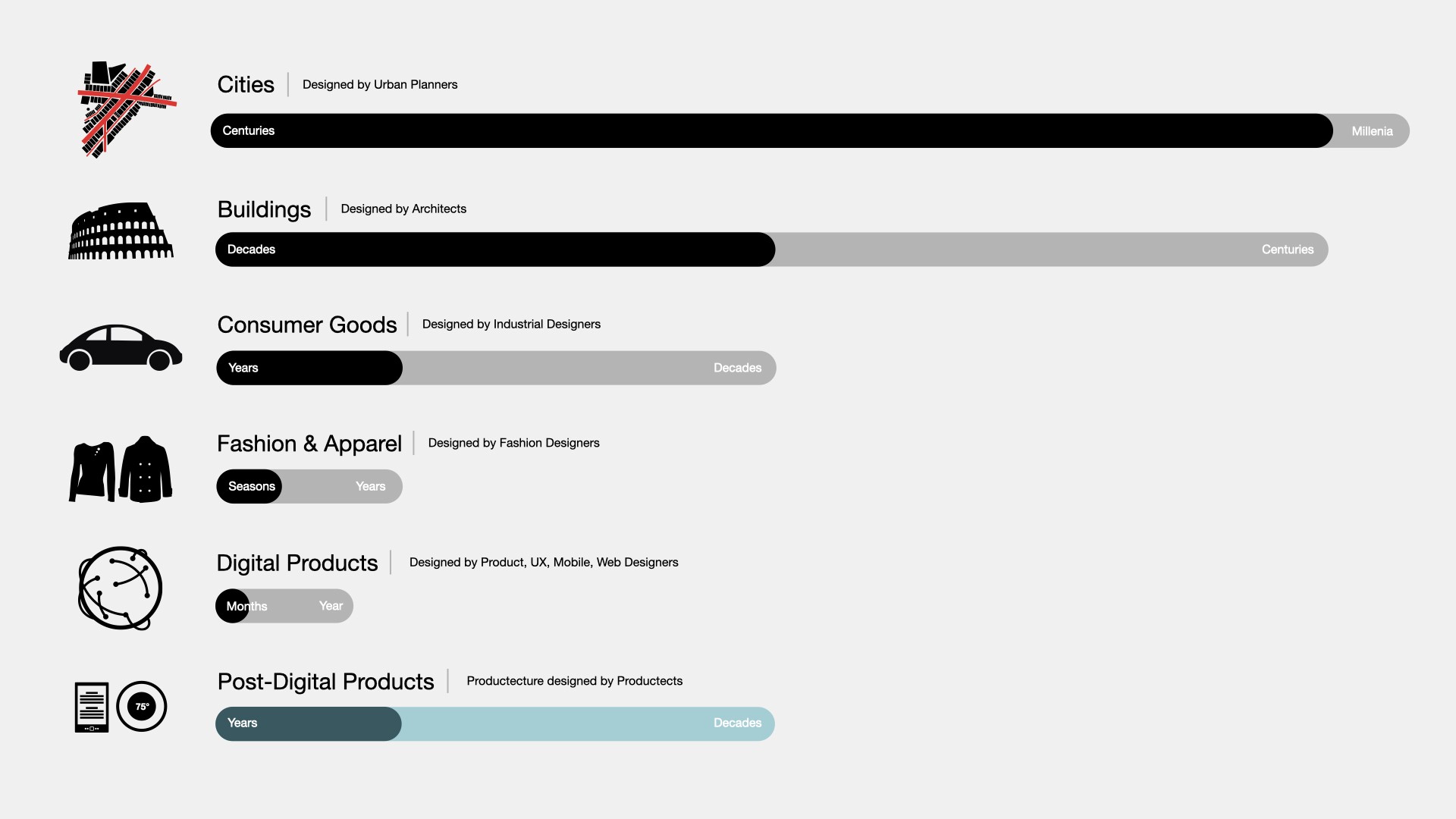 Examining the Intended & Extended Life of ProductsUp until the Digital era, the world around us has been designed for longevity, either by intention, or by extension. Digital products do not age well. They tend to disappear. Post-Digital products by intention, are meant to live long.