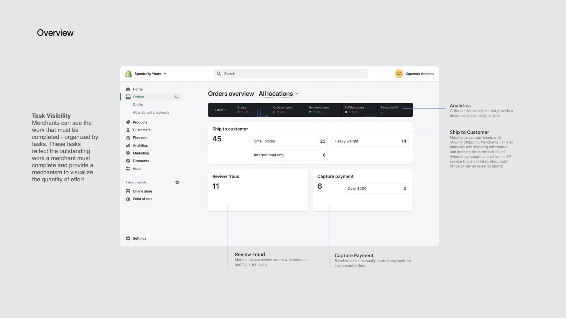 When I joined, Order Tasks had been running for three to six months. The concept was a task-driven triage layer - a new surface that bucketed orders by status: open, received today, ready to fulfill, shipped, fraud alerts. Merchants would triage from the task view, then drill into filtered sub-lists.