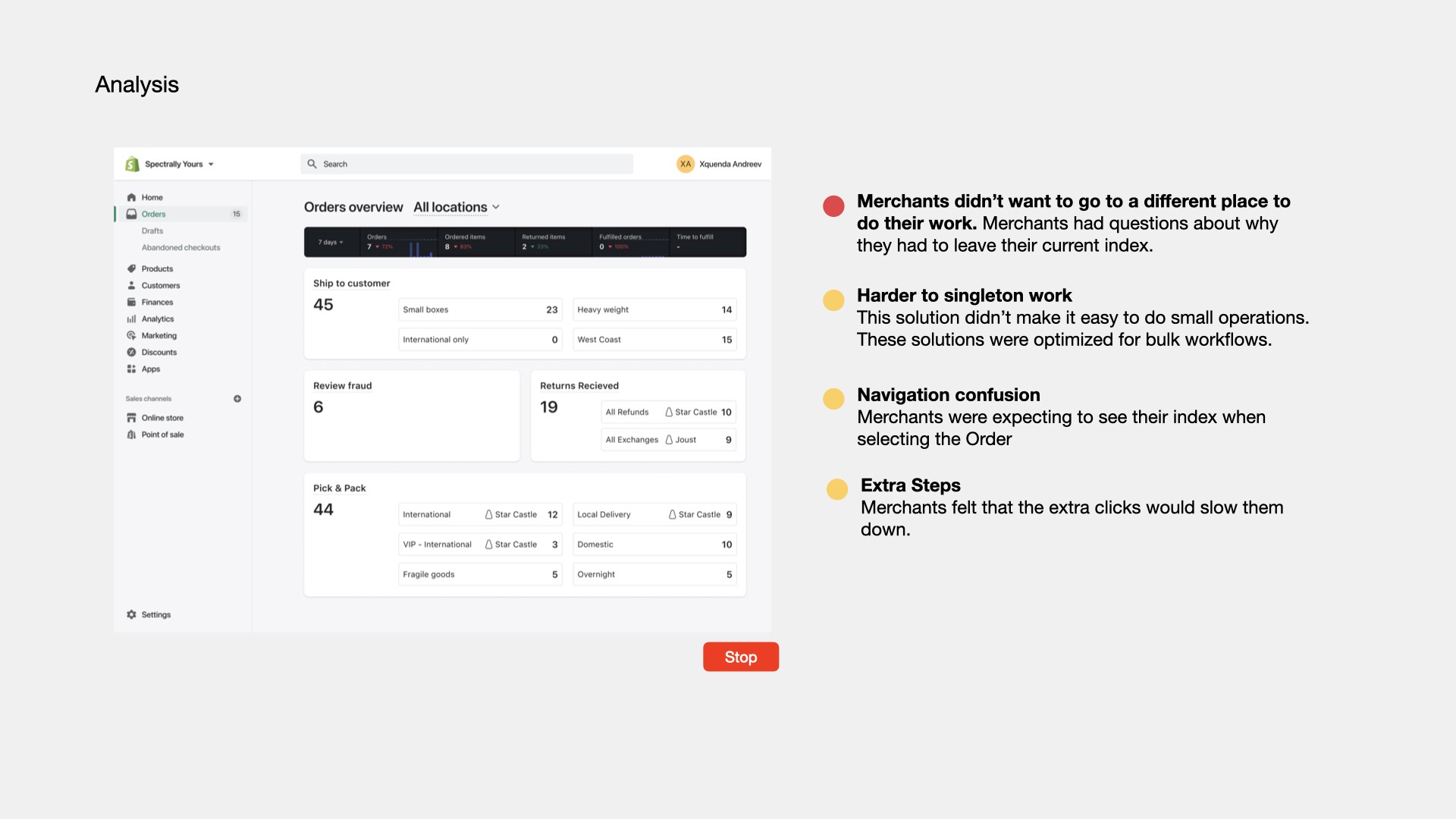 Result: Research surfaced a critical insight - merchants wouldn't leave the orders index. Direction pivoted before engineering investment locked in.